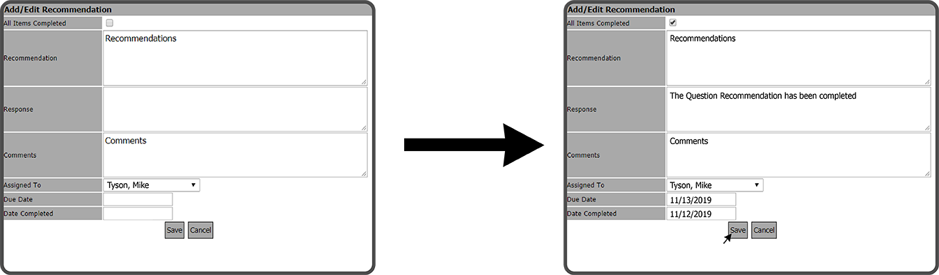 This will open the Add/Edit Recommendation window. Check the All Items Completed Box, enter a Response, enter the Date Completed, and select the Save Button