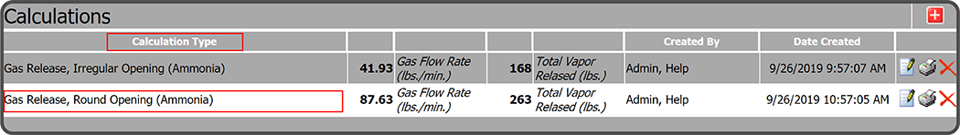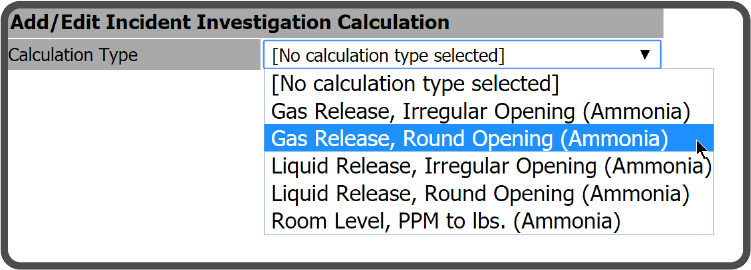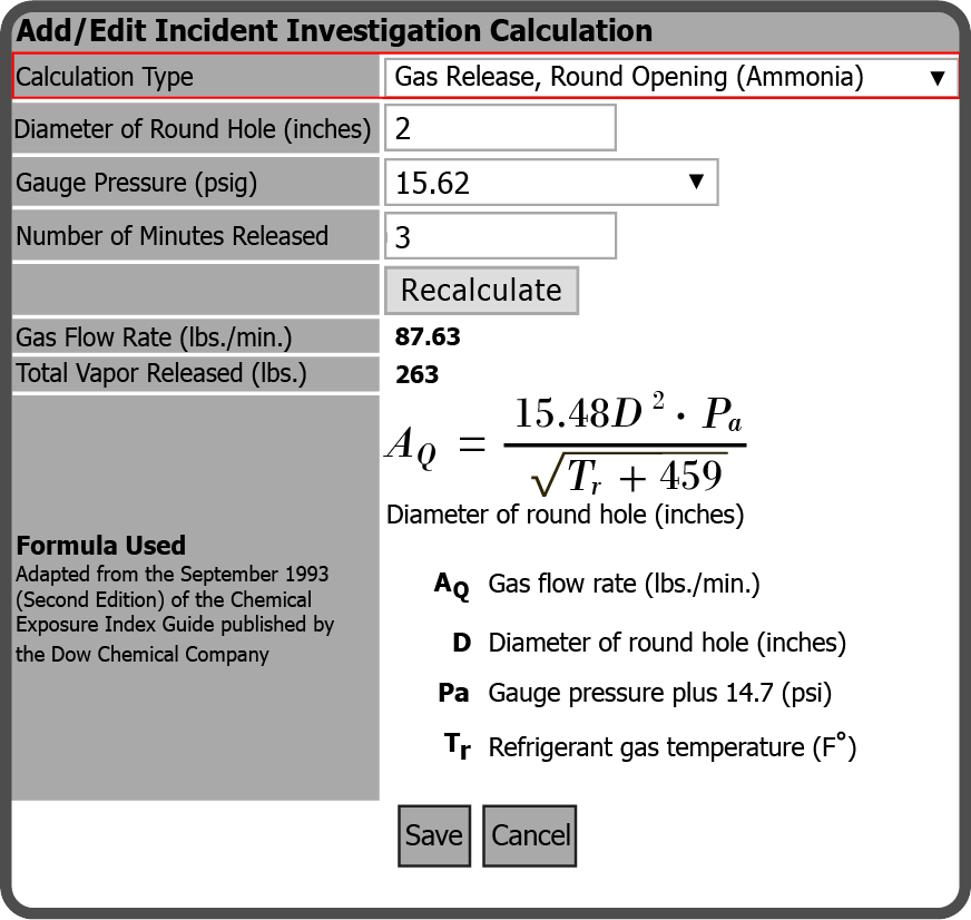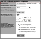 After selecting this Calculation Type, enter information for the Diameter of Round Hole, Gauge Pressure — which will give you the Gas Flow Rate value — then enter the Number of Minutes Released and Recalculate Button