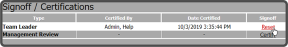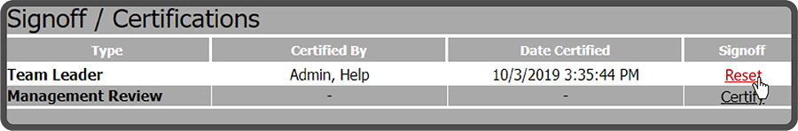 To reset an Incident Investigation Team Leader Signoff, select the Reset link in the Signoff/Certifications section at the bottom of the Incident Investigation page.
