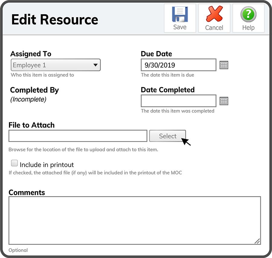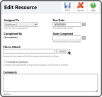 This will open the Edit Resource window. Enter a date in the Date Completed field. To attach a file to the Resource, use the Select Button