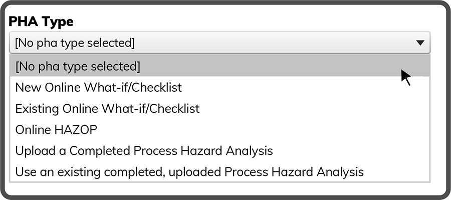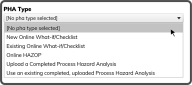 | Existing Online What-if/Checklist | Allows you to select an existing What-if/Checklist PHA within the PHA area of the APSM Portal |