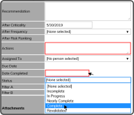 To complete a Recommendation, describe in the Action Field the Actions that completed the Recommendation. Next, enter a Date manually in the Date Completed Field and/or select Complete in the Status Field. Then select the Save Button