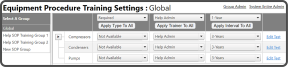 From the Equipment Procedure Training Settings Grid you can assign Equipment Procedures, Trainers, and Training Intervals to SOP Groups. You can also access the Equipment Procedure Test Settings.