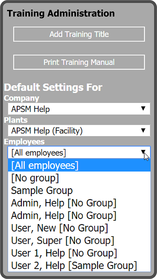 To setup Training at the Employee level for a Plant, select an Employee from the Employee field on the left side of the page.