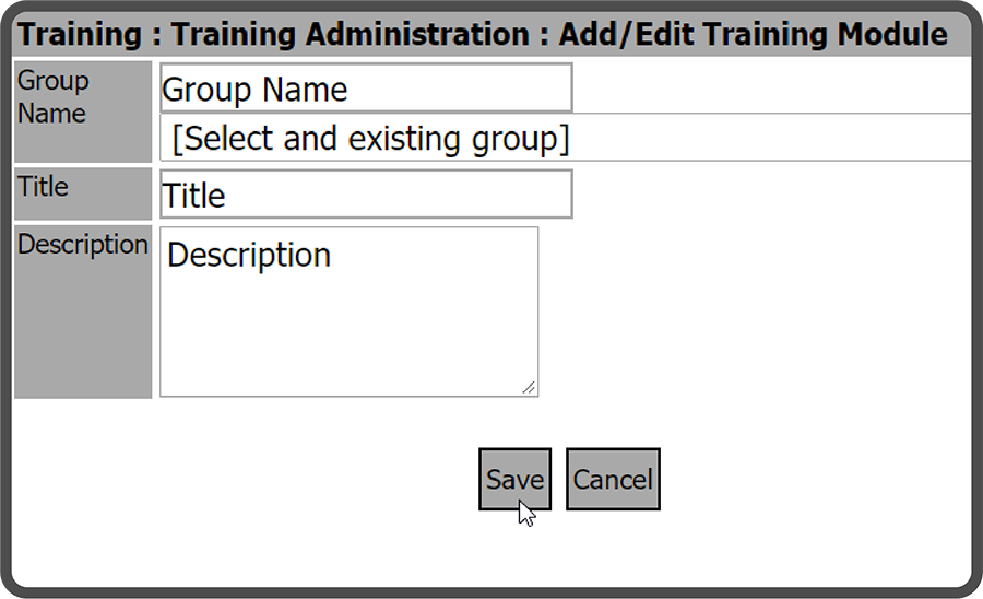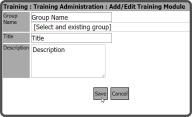 This will open the Training: Training Administration: Add/Edit Training Module. Enter (or select) a Group Name, Title, Description, and select the Save Button