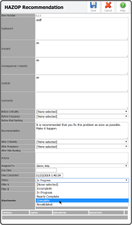 To complete a HAZOP Recommendation, enter any Comments (optional), enter the Actions used to complete the Recommendation, enter the Date Completed, change the Status to Complete using the drop down, add Attachments (optional), and select theSave Icon