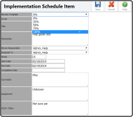 To complete an Implementation Schedule Item Task, select 100% in the Percent Complete field, enter a Completion Date, add Comments (optional), enter the Action Taken to complete the Task, and select the Save Icon