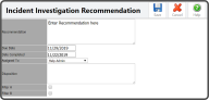 To complete an Incident Investigation Recommendation Task, enter the Date Completed, Disposition (Action that resolved the recommendation), and select the Save Icon