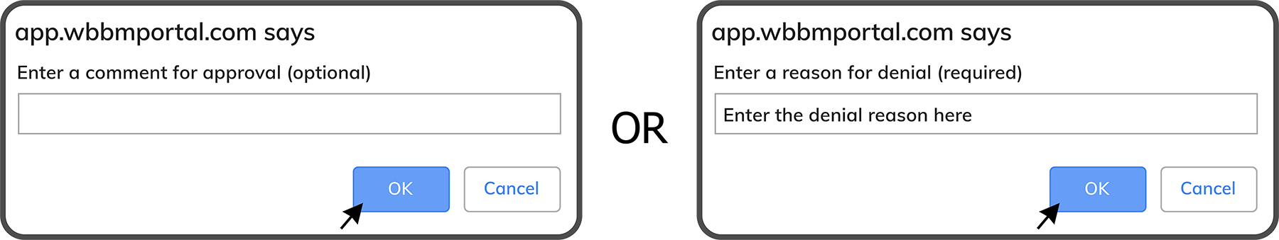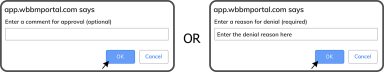 This will open the Enter a comment for approval (optional) or Enter a reason for denial (required) window. Enter a comment (optional for approval, required for denial) and select the OK Button